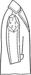 При изготовлении одежды по индивидуальным заказам возникает необходимость предварительного вметывания рукавов, эту операцию выполняют со следующими рекомендациями. Для создания соответствующего внешнего вида и для обеспечения необходимой свободы движения руки посадку оката рукава размещают по длине линии проймы различно в зависимости от требований, предъявляемых к тому или другому участку. Условно окат рукава можно разделить на пять участков (рис. 2). Участок 1 — от контрольной надсечки на линии переднего переката до переднего шва и далее на такое же расстояние по нижней части рукава. Рукав соединяют с проймой без посадки, что обеспечивает сохранение положения линии переднего переката.