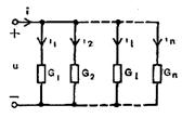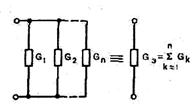 Залежність i =Gэ u не відрізняється від залежності між напругою і струмом в резисторі з провідністю G э. Отже, при паралельному з'єднанні декількох (n) резисторів це двополюсне коло можна замінити одним еквівалентним резистором, провідність якого дорівнює сумі провідностей резисторів, що входять в з'єднання (рис. 4.2). Оскільки
