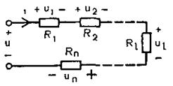 Встановимо тепер співвідношення між напругою і струмами в двополюснику, складеному з п сполучених послідовно резисторів (рис. 4.4).