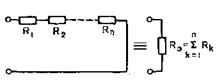 У відповідності з другим законом Кірхгофа при послідовному з'єднанні u - и 1 - u 2 -…- u n = 0, або u = u 1 + u 2 + …+ u n. Якщо тепер виконати викладення, аналогічні приведеним вище, можна прийти до наступних висновків. Двополюсне резистивне коло з резисторів, сполучених послідовно (рис. 4.5), можна замінити одним еквівалентним резистором, опір якого рівний сумі опорів резисторів, що входять в з'єднання, тобто