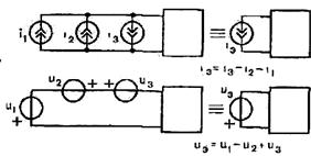 Якщо в колі є не одне, а декілька джерел струму, сполучених паралельно, ці джерела можна, відповідно до першого закону Кірхгофа, замінити одним джерелом, задавальний струм якого рівний алгебраїчній сумі задавальних струмів джерел, що входять в з'єднання, і орієнтований так само, як і струми тих джерел, які входять в суму із знаком «+». Аналогічно, згідно другому закону Кірхгофа, джерела напруги, сполучені послідовно, можна замінити одним джерелом, задавальна напруга якого дорівнює алгебраїчній сумі задавальної напруги джерел, що входять в з'єднання, і орієнтована так само, як і доданки, що входять в суму із знаком «+». Пояснюючі приклади приведені на рис. 4.7.