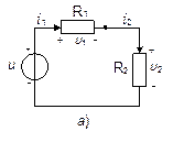 Схема простого послідовного резистивного кола, що містить джерело напруги і два резистори, сполучених послідовно, показана на рис. 4.6. Для нього: