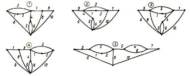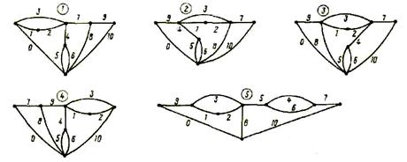 2. Завдання для самостійної роботи 1. Досліджувана схема вибирається в відповідності з графом (рис. 10.1). Номер графа, заданий викладачем, взяти з рисунка 10.1. Включені в схему елементи вибираються в відповідності зі своїм варіантом за даними таблиці 10.1. 2. Параметри елементів електричної схеми мають наступні значення: Rl = (n+m), Ом; R2 = (n+m) 103, Ом; R 3 = n, Ом; R 4 = n ×104, Ом; R5 = 2 (n + m), Ом; L = 10 n/m, мГн; С = пт 10 -2, мкФ; Rн = (n + m) 103, Ом. Прийняти m =1, n = номер студента за списком у групі. В нульову гілку включається джерело напруги U = 10 в, в десяту – навантаження Rн = n ×103 Ом, в сьому включається ключ (у вихідному стані ключ розімкнутий). Ключі працюють на замикання. Розглядаються наступні випадки, коли в схемі крім резисторів є: а) джерело напруги і індуктивність; б) джерело напруги і ємність. Орієнтація джерела вибирається самостійно або задається викладачем. 3. Розрахувати напруги і струми всіх елементів схеми після комутації при нульових початкових умовах. Записати закони комутації. 4. Побудувати графік зміни струму індуктивності або напруги на ємності. 5. Розрахувати перехідні коливання струму індуктивності і напруги на ємності. 6. Розрахувати струми і напруги резисторів.