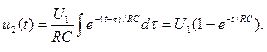 Приклад 2. На вхід RС - кола( див. рис. 11.1) подається стрибок напруги f 1(t) = U 1. Визначити реакцію кола на виході з використанням інтеграла накладання (7). Імпульсна характеристика даного кола дорівнює: hu (t) = 1/ RC e – t / RC . Тоді, підстав-ляючи hu (t – t) = 1/ RC e –(t- t )/ RC у формулу (7), отримуємо: