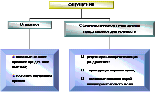 Тема 2.1. Ощущение, восприятие, представление, воображение Ощущение — это простейший психический познавательный процесс отражения в сознании человека отдельных свойств и качеств предметов и явлений, непосредственно воздействующих на его органы чувств. Механизмы формирования ощущений. Жизненная роль ощущений состоит в том, чтобы своевременно и быстро доводить до ЦНС как главного органа управления деятельностью сведения о состоянии внешней среды, присутствии в ней биологически значимых факторов. Физиологической основой ощущений является деятельность анализаторов, которые состоят из: v рецепторов, воспринимающих раздражение; v проводящих центростремительных (аффективных) нервных путей, по которым возбуждение, возникающее в рецепторах, передается в соответствующие участки коры головного мозга; v центральных корковых отделов анализатора, где происходит обработка нервных сигналов, поступающих от рецепторов.