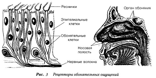 Обонятельные ощущения помогают человеку распознать летучие вещества и запахи. Обонятельные рецепторы расположены в каждой половине носовой полости (около 30 млн). До сих пор малоизвестно, как происходит распознание. Теоретически различают 7 основных групп запахов: 1. эфирный (ацетон) 2. камфорный (нафталин) 3. мускусный (мускус) 4. цветочный (запах розы) 5. ментальный (мята) 6. острый (уксус) 7. гнилостный (запах тухлого яйца)