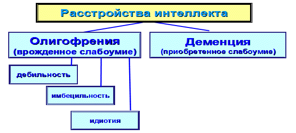 Различают врожденное слабоумие (олигофрения) и приобретенное слабоумие (деменция). Олигофрения бывает различной степени выраженности. По степени тяжести различают дебильность (дебилы способны к обучению в специальных школах), имбецильность, идиотию. Деменция возникает вследствие сосудистых заболеваний головного мозга или органического поражения центральной нервной системы.