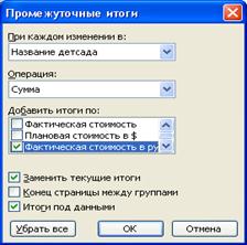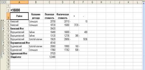 3. Команда Итоги: назначение, технология выполнения, особенности работы с командой. Команда Итоги помогает упорядочить список посредством группировки записей с выводом промежуточных итогов, средних значений или другой вспомогательной информации. Она также применяется вывода итоговой суммы в верхней или нижней части списка и облегчает суммирование числовых столбцов. Кроме того, эта команда отображает список в виде структуры, что позволяет разворачивать и сворачивать разделы простыми щелчками мыши. Технология включения промежуточных итогов в список производится так: - организовать список так, чтобы записи каждой группы следовали в нем подряд: отсортировать список по тому полю, на котором основы группы (по наименованию материала, фамилии и т.д.); - стать на таблицу и выполнить команду Данные – Итоги – открывается диалоговое окно Промежуточные итоги; - выберите из раскрывающегося списка При каждом изменении в группу, для которой определяются промежуточные итоги. Это должен быть тот же столбец, по которому сортировался список; - выберите из списка Операция статистическую функцию, которая будет использоваться для вычисления промежуточного итога (чаще СУММ, КОЛ-ВО значений, СРЕДНЕЕ, МАКСИМУМ, МИНИМУМ, ПРОИЗВЕДЕНИЕ и др.); - выберите из списка Добавить итоги по столбец или столбцы для расчета промежуточного итога. Установка некоторых флажков позволяет вычислить итоги по нескольким столбцам, однако, не надо забывать снимать ненужные флажки – ОК.