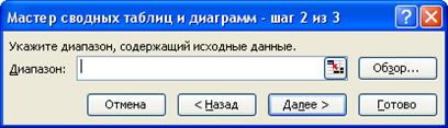1. Понятие сводной таблицы. Сводными называются вспомогательные таблицы, которые содержат часть данных анализируемой таблицы, отобранных таким образом, чтобы зависимости между ними отображались наилучшим образом. Они являются мощным средством по работе с базами данных, так как полезны как для анализа, так и для обобщения информации, хранящейся в базе данных, на рабочих листах, во внешних файлах. Сводные таблицы создаются на основе области таблицы, целой таблицы или нескольких таблиц. Сводную таблицу можно использовать в качестве источника данных для новой сводной таблицы. Сводные таблицы являются динамическими объектами, позволяющими выводить информацию с различной степенью детализации. 2. Мастер Сводных таблиц и технология построения таблиц. Сводная таблица создается с помощью Мастера сводных таблиц, который следит за вводом информации, помогает производить необходимые вычисления и форматировать таблицу. После создания таблицы можно продолжить ее подготовку посредством перестановки полей и наложения новых форматов. Мастер сводных таблиц предоставляет полный контроль над расположением заголовков строк и столбцов таблице. Технология построения сводной таблицы следующая: 1.В исходной таблице выделить любую ячейку в списке, который будет просматриваться с помощью сводной таблицы. 2. Выполнить команду Данные – Сводная таблица – запускается Мастер сводных таблиц, который просит указать источник данных для таблицы (см. рисунок) 3. Убедитесь в том, что установлен первый переключатель В списке или БД MS Office Excel и нажмите кнопку Далее. В данном случае мы создаем Сводную таблицу на основании списка на листе. Однако такие таблицы также можно создавать по внешним данным, по нескольким диапазонам консолидации или по другой сводной таблице.