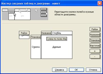 В окне имеются четыре области: · Строка – для использования данных поля, расположенного в этой области, в качестве заголовков строк; · Столбец – для использования данных поля, расположенного в этой области, в качестве заголовков столбцов; · Данные – для суммирования значений поля (просуммированы функцией СУММ), расположенного в этой области, в ячейках сводной таблицы; · Страница – для обеспечения возможности вывода данных сводной таблицы, относящихся только к полю, расположенному в этой области.