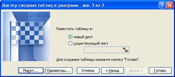 Допустимыми операциями подведения итогов являются: сумма, количество значений, среднее арифметическое, максимальное и минимальное значение и др. 6. Нажмите на кнопку Далее – открывается последнее окно Мастера сводных таблиц. По умолчанию Excel создает сводную таблицу на новом листе, однако можно выбрать для нее существующий лист и даже указать точное расположение в ячейках. Нажать кнопку ГОТОВО, чтобы подтвердить значения, принятые по умолчанию и завершить создание таблицы.