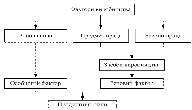 Виробництво - процес створення благ, необхідних для задоволення різноманітних потреб людини. Створення матеріальних благ завжди є суспільним процесом. Це означає, що в процесі виробництва люди вступають у відносини не лише з природою, а й між собою. Ці відносини отримали назву виробничих або економічних відносин. Виробничі відносини не слід розуміти лише як відносини, що виникають між людьми безпосередньо в процесі виробництва матеріальних благ або послуг. Під виробництвом, а точніше "суспільним виробництвом", економісти розуміють весь процес відтворення, який включає в себе чотири стадії: безпосередньо виробництво як процес створення матеріальних благ (послуг); розподіл, в результаті якого кожен учасник суспільного виробництва отримує свою частку у виробленому національному продукті (в натурі або в певній сумі грошей); обмін, в процесі якого отримана частка при розподілі (натуральна, грошова) обмінюється на необхідні конкретні засоби існування; споживання -тут вироблений продукт завершує свій рух, відбувається його кінцеве споживання, й тим самим дається поштовх до розпочинання нового виробничого циклу. Тому, коли ми говоримо про виробничі відносини, розуміємо під ними всю їх сукупність. А саме: відносини виробництва, розподілу, обміну й споживання. Виробничі відносини виникають також і в процесі організації виробництва та управління ним. Структура виробничих відносин суспільства неоднорідна і включає в себе: соціально-економічні (виробництво, розподіл, обмін, споживання) і організаційно-економічні відносини (поділ праці, спеціалізація, кооперування, комбінування, орг-ція і управління). Будь-яке виробництво, первісне чи сучасне, характеризується деякими спільними рисами. Воно має в основі єдині фактори: робочу силу людини, предмет праці і засоби праці. Робоча сила – це сукупність фізичних та інтелектуальних здібностей людини, які вона використовує у процесі виробництва. Предмет праці – те, на що скерована діяльність людини, з чого вона виробляє необхідні матеріальні блага. Засоби праці – це інструменти, знаряддя, за допомогою яких люди обробляють предмет праці, виготовляючи з нього необхідні засоби існування. Предмети праці в сукупності з засобами праці складають засоби виробництва. Робоча сила виступає в якості особистого фактора виробництва. Засоби виробництва складають речовий фактор виробництва. Для того, щоб почався процес виробництва засоби виробництва необхідно поєднати з робочою силою. Отже, особистий та речовий фактори виробництва повинні постійно взаємодіяти. В результаті такої взаємодії факторів виробництва виникає нова категорія – продуктивні сили. Продуктивні сили суспільства - це сукупність особистих і речових факторів виробництва в їх взаємодії та взаємозв'язку. Головну роль тут відіграє особистий фактор – людина, яка створює засоби виробництва, приводить їх у дію. Людина – головна продуктивна сила суспільства. Разом з тим засоби виробництва і насамперед знаряддя – це найреволюційніший елемент продуктивних сил. Вони швидко змінюються, вдосконалюються, що пов’язано з розвитком людини, підвищенням її освітнього, кваліфікаційного рівня, поліпшенням організації праці та управління. Функціональна структура продуктивних сил: