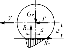 В результаті епюра нормальних тисків, симетрична в випадку нерухомого колеса, а при коченні змінюється, збільшуючись спереду і зменшуючись ззаду. Рівнодіюча цих реакцій Rz, перпендикулярна до напрямку руху і рівна силі тиску колеса Gk, на опорну поверхню, при коченні колеса зміщується в сторону руху на віддаль а. Реакція Rz створює відносно центра колеса момент опору коченню Mf: Mf=Rz∙a (1) В випадку рівномірного руху цей момент врівноважується моментом, який створюється штовхаючою силою Р на плече, яке рівне динамічному радіусу колеса rд. Rz∙a = P∙rд (2) Звідки: Внаслідок тертя між покришкою і дорогою в елементах поверхні їх контакту виникають дотичні реакції, які діють в сторону, протилежну напрямку штовхаючої сили Р. На твердій дорозі ці реакції паралельні напрямку руху і становлять рівнодіючу Rx, яка при рівномірному русі дорівнює силі опору коченню Рfk. Величина Беручи до уваги, що Rz = Gk, вираз (3) можливо записати в вигляді