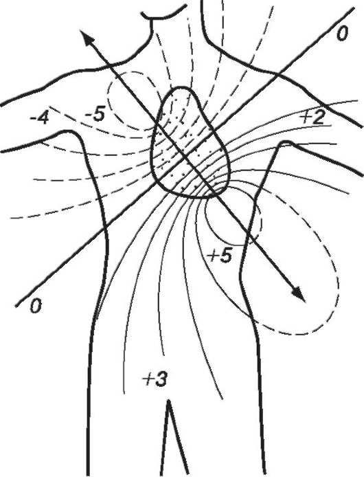 Допущения теории Эйнтховена Электрическое поле сердца на больших расстояниях от него подобно полю токового диполя; дипольный момент - интегральный электрический вектор сердца (суммарный электрический вектор возбужденных в данный момент клеток). Все ткани и органы, весь организм - однородная проводящая среда (с одинаковым удельным сопротивлением). Электрический вектор сердца изменяется по величине и направлению за время сердечного цикла, однако начало вектора остается неподвижным. Точки стандартных отведений образуют равносторонний треугольник (треугольник Эйнтховена), в центре которого находится сердце - токовый диполь. Проекции дипольного момента сердца - отведения Эйнтховена. В каждый данный момент деятельности сердца его дипольный электрический генератор создает вокруг электрическое поле, которое распространяется по проводящим тканям тела и создает потенциалы в его различных точках. Если представить, что основание сердца заряжено отрицательно (имеет отрицательный потенциал), а верхушка положительно, то распределение эквипотенциальных линий вокруг сердца (и силовых линий поля) при максимальном значении дипольного момента Рс будет таким, как на рис. 13.10. Потенциалы указаны в некоторых относительных единицах. Вследствие асимметричного положения сердца в грудной клетке его электрическое поле распространяется преимущественно в сторону правой руки и левой ноги, и наиболее высокая разность потенциалов может быть зафиксирована в том случае, если электроды разместить на правой руке и левой ноге.