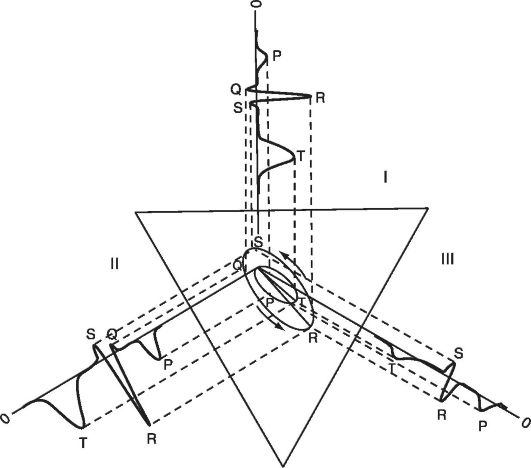 Теоретический анализ электрокардиограмм сложен. Развитие кардиографии шло в основном эмпирическим путем. Катц указывал, что расшифровка электрокардиограмм производится на основе опыта, опирающегося лишь на самое элементарное понимание теории возникновения биопотенциалов. Данные ЭКГ обычно дополняют клиническую картину заболевания. На рисунке 13.11 представлена нормальная электрокардиограмма человека (обозначения зубцов были даны Эйнтховеном и представляют взятые подряд буквы латинского алфавита). Она представляет собой график изменения во времени разности потенциалов, снимаемой двумя электродами соответствующего отведения за цикл работы сердца. Горизонтальная ось является не только осью времени, но и осью нулевого потенциала. ЭКГ представляет собой кривую, состоящую из трех характерных зубцов, обозначающихся Р, QRS, T, разделенных интервалом нулевого потенциала. Высоты зубцов в различных отведениях обусловлены направлением электрической оси сердца, т.е. углом α (см. рис. 13.9). Электрокардиограмма, записанная при норме в стандартных отведениях, характеризуется тем, что ее зубцы в разных отведениях будут неодинаковы по амплитуде (рис. 13.12).