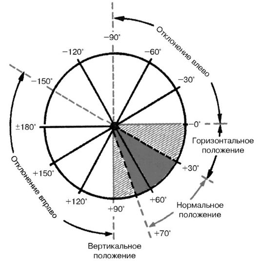ОПРЕДЕЛЕНИЕ ПОВОРОТОВ СЕРДЦА ВОКРУГ ПЕРЕДНЕЗАДНЕЙ, ПРОДОЛЬНОЙ И ПОПЕРЕЧНОЙ ОСЕЙ Повороты сердца вокруг переднезадней оси сопровождаются отклонением электрической оси сердца (среднего результирующего вектора А QRS) во фронтальной плоскости и существенным изменением конфигурации комплекса QRS в стандартных и усиленных однополюсных отведениях от конечностей. Различают следующие варианты положения электрической оси сердца (рис. 3.13):