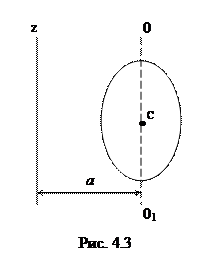 где интегрирование производится по всему объему тела. Величина r в данном случае есть функция положения точки с координатами x, y, z. Неподвижная ось вращения z может проходить как через центр инерции тела (ось вращения маховика, ротора турбины и т.п.), так и вне его (например, ось вращения самолета, выполняющего мертвую петлю). Если известен момент инерции тела относительно оси, проходящей через его центр масс (инерции), то момент инерции относительно любой другой параллельной оси определяется теоремой Штейнера (теоремой о переносе осей инерции): момент инерции тела J z относительно произвольной оси вращения z равен сумме момента инерции тела относительно оси ОО1, проведенной через центр инерции С тела параллельно оси z и произведения массы тела на квадрат расстояния между этими осями (рис. 4.3):