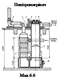 У ряді випадків, коли в діючому цеху неможливо установити рекуператор, що використовує ваграночні гази, застосовують повітронагрівачі, опалювальні природним газом чи мазутом. На мал. 6.6. показаний повітронагрівач, опалювальний природним газом. Температура повітря регулюється автоматично з точністю +-5 оС. Витрата природного газу складає 15 м2 на 1 т шихти; економія коксу 45 кг на 1 т шихти. Температура підігріву дуття досягає 500-550оС.
