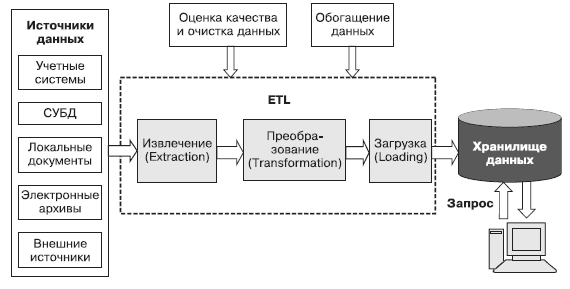 В основе процедуры консолидации лежит процесс ETL (extraction, transformation, loading). Процесс ETL решает задачи извлечения данных из разнотипных источников, их преобразования к виду, пригодному для хранения в определенной структуре, а также загрузки в соответствующую базу или хранилище данных. Если у аналитика возникают сомнения в качестве и информативности исходных данных, то при необходимости он может задействовать процедуры оценки их качества, очистки или обогащения, которые также являются составными частями процесса консолидации данных.