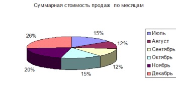 Пример рассмотрен на данном сайте в <Microsoft Excel>→<7.3. Пример построения круговой диаграммы>. Построим круговую диаграмму. Для этого в таблице (рис. 42) выделим диапазон С13:H13 и вызовем Мастер диаграмм.