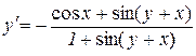 Наприклад: 1) В першому прикладі можна перейти від неявно заданої функції до явно заданої: Покажемо на прикладі як обчислюється похідна від функції заданої неявно. Нехай задана функція Продиференціюємо останню рівність, враховуючи, що cos(y(x)+x) складна функція: