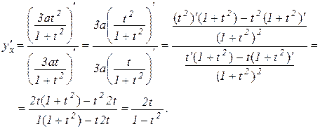 де а – радіус кола. Значення параметра t в точках на осі ОХ дорівнює Перейдемо до обчислення похідної від функції заданої параметрично. Нехай За теоремою 8.7 отримуємо