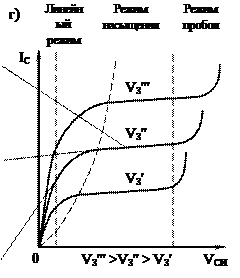Основной статической характеристикой прибора является выходная (стоковая) вольтамперная характеристика в схеме с общим истоком I С = I С(V СИ) при VЗИ = const. (2) На ней различают крутую область (линейный режим), пологую область (режим насыщения) и область (режим) пробоя (рис. 6г). При V ЗИ > V T и V СИ = 0 тока в канале нет, а МОП-структура находится в состоянии равновесия в режиме сильной инверсии.