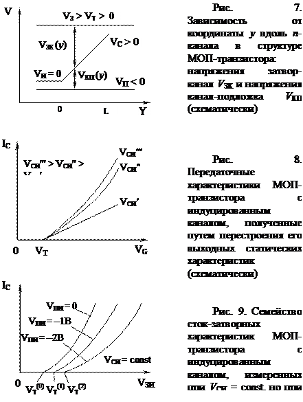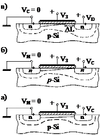 При V ЗИ > V T и малых положительных напряжениях V СИ канала не перекрыт (рис. 6а) и вдоль него действует слабое электрическое поле, благодаря которому электроны (основные носители инверсного канала) совершают дрейф от истока к стоку.