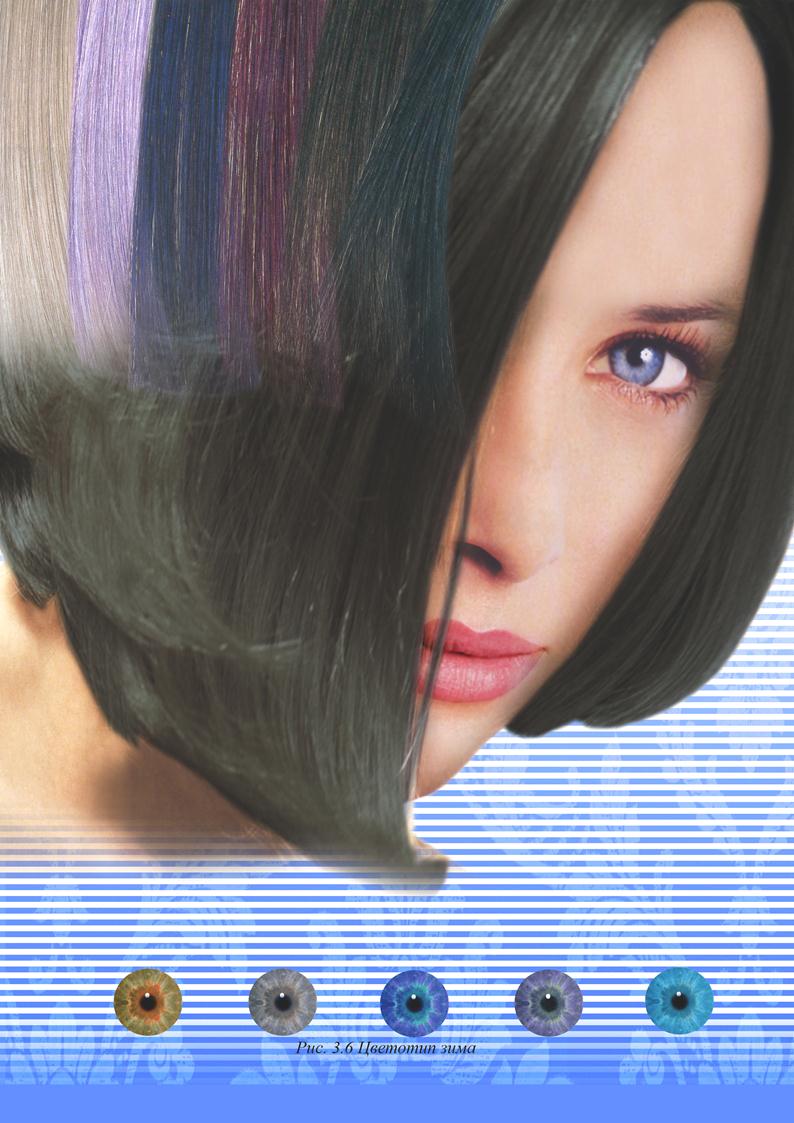 Цвет лица. Для цвета лица зимнего типа характерен холодный, голубоватый подтон и равномерность без румянца. Встречаются два типа «зимнего» цвета лица: 1. Тип «Белоснежки»: кожа очень светлая и при этом настолько прозрачная и чистая, что кажется благородно-фарфоровой. Лишь очень редко бледность лица оживляется лёгким розовым дуновением румянца. Такая кожа хоть и загорает, но приобретает при этом не коричневый, а нежный оливковый тон. 2. Южный тип: кожа имеет холодный, слегка оливковый тон, который можно спутать с интенсивным вариантом осеннего типа. Верный признак, по которому можно безошибочно идентифицировать зимний тип – это способность кожи к пигментации. На солнце она быстро приобретает интенсивный оливковый загар. Зимний тип легко можно узнать и по тёмным ресницам и бровям, а также по цвету губ, который скорее склонен к синеватому, нежели к жёлтому тону.