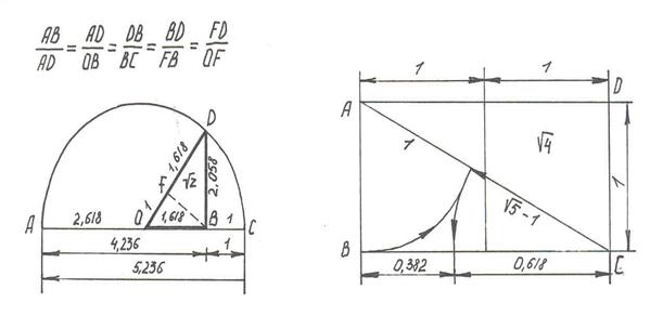 Рисунок включает треугольник √z, и иллюстрирует связь величин так называемого “золотого сечения”. “Золотое сечение” было известно еще художникам и архитекторам античности. В эпоху Возрождения эту пропорцию называли “божественной”, по-видимому, потому что она обладает замечательным свойством рядов сложения, отражающих идею роста: каждый последующий член такого ряда есть сумма двух предыдущих членов. Простейшим рядом сложения является целочисленный ряд “золотого сечения”: 1, 2, 3, 5, 8, 13, 21, 34, 55, 89, 144, 233 и т. д., называемый “рядом Фибоначчи”, по имени открывшего его в 1202 г. знаменитого итальянского математика Леонардо Пизанского, более известного по прозвищу Фибоначчи.