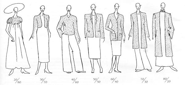 Иллюзии, возникающие при использовании разных пропорций одежды, меняют представления о реальных размерах фигуры. Например, завышенная талия в платье или короткий жакет с длинной юбкой укорачивают верхнюю часть, тем самым, удлиняя ноги. Более длинная верхняя часть позволяет подкорректировать короткий торс. Пропорция 50/50, где верхняя и нижняя части костюма равны, является не самой гармоничной, так как, возникает переоценка размеров верхней части фигуры и ноги кажутся короче, чем они есть (рис. 4.12).
