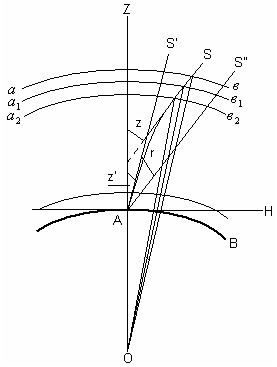 Проходя через земную атмосферу, лучи света изменяют прямолинейное направление. Вследствие увеличения плотности атмосферы преломление световых лучей усиливается по мере приближения к поверхности Земли. В результате наблюдатель видит небесные светила как бы приподнятыми над горизонтом на угол, получивший название астрономической рефракции. Рефракция является одним из главных источников как систематических, так и случайных ошибок наблюдений. В 1906г. Ньюкомб писал, что нет такой отрасли практической астрономии, о которой бы так много писали, как о рефракции, и которая была бы в таком неудовлетворительном состоянии. До середины 20 века астрономы редуцировали свои наблюдения по таблицам рефракции, составленным в 19 веке. Основным недостатком всех старых теорий было неточное представление о строении земной атмосферы. Примем поверхность Земли АВ за сферу радиуса ОА=R, а атмосферу Земли представим в виде концентрических с ней слоёв ав, а1в1, а2в2 …с плотностями, увеличивающимися по мере приближения слоёв к земной поверхности (рис.2.7). Тогда луч SA от какого-нибудь очень отдалённого светила, преломляясь в атмосфере, придёт в точку А по направлению S¢A, отклонившись от своего первоначального положения SA или же от параллельного ему направления S²A на некоторый угол S¢AS²= r, называемый астрономической рефракцией. Все элементы криволинейного луча SA и окончательное видимое его направление AS¢ будут лежать в одной и той же вертикальной плоскости ZAOS. Следовательно, астрономическая рефракция только повышает истинное направление на светило в проходящей через него вертикальной плоскости.