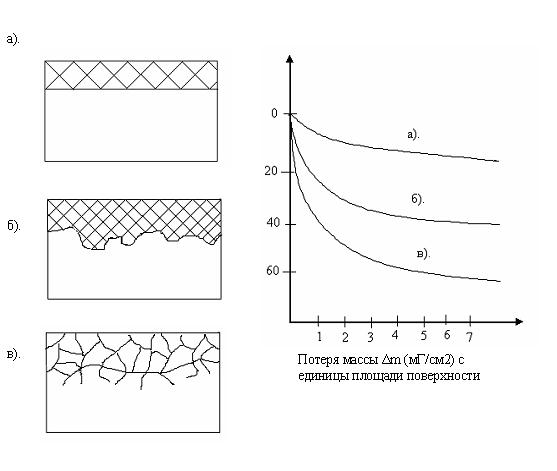 Рис. 1 Основные разновидности электрохимической коррозии (схемы) и их относительное влияние на прочность листового дуралюминия (графики): а). равномерная коррозия; б). местная коррозия; в). межкристаллитная коррозия