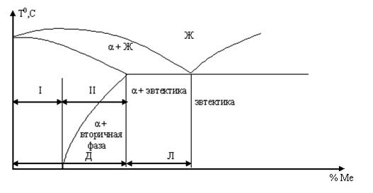 Рис. 2 Типовая диаграмма (схема) состояния системы Al – легирующий элемент (Ме). Д – деформируемые сплавы, Л – литейные. I – деформируемые сплавы, не упрочняемые термической обработкой; II - деформируемые сплавы, упрочняемые термической обработкой.