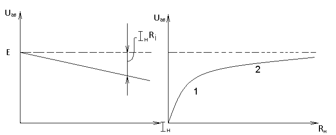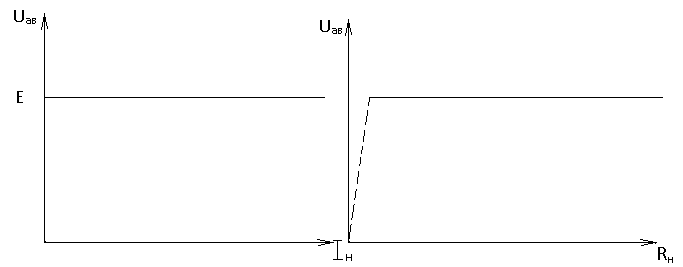 б) в) Рис.1.8. Идеальный источник ЭДС: а) схема нагружения; б) внешняя (нагрузочная) характеристика Uн=f1( в) - - - - - - - - - - - - - - Uн=f2(Rн) У реального источника ЭДС при изменении тока нагрузки (сопротивления нагрузки) напряжение Uaв несколько падает, что объясняется ростом потерь на внутреннем сопротивлении источника (рис.1.9.).