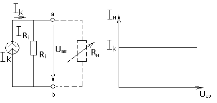 В качестве источников эл. энергии рассматриваются источники ЭДС и источники тока. Идеальный источник ЭДС имеет нулевое внутреннее сопротивление Ri и, следовательно, неизменное напряжение на зажимах равное напряжению холостого хода при любых токах нагрузки (при любых сопротивлениях нагрузки), рис.1.8 Uaв измен. при любых Rн