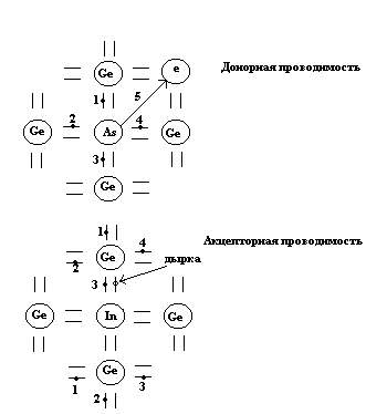 Полупроводник приобретает проводимость в том случае, если электронам, находящимся на энергетических уровнях внутри валентной зоны, внешним воздействием (нагреванием, освещением) сообщается энергия (равная или больше DW), достаточная для перехода электронов из валентной зоны в зону проводимости. Электрон, находящийся в зоне проводимости и являющийся подвижным носителем заряда, называется электроном – проводимости. Одновременно в валентной зоне из-за ухода электрона появляются свободные уровни и, следовательно, валентные электроны тоже получают возможность переходить с одних уровней на другие (свободные) и тем самым изменять энергию. Валентные электроны, как и электроны проводимости, могут создавать ток через полупроводник. При уходе валентного электрона образуется положительный заряд, равный по абсолютной величине заряду электрона; этот положительный заряд следует относить к валентной связи между двумя атомами, нарушенной уходом валентного электрона. Незанятое электроном энергетическое состояние в валентной зоне, обладающее положительным зарядом, называется дыркой. При создании электронного поля в полупроводнике валентные электроны переходят из заполненных связей в соседние незанятые связи в направлении увеличения потенциала поля, что эквивалентно перемещению дырок в обратном направлении. Итак – в полупроводниковых приборах возможны 2 вида электропроводимости – электронная (в результате перемещения электронов проводимости) и дырочная (в результате перемещения дырок). Полупроводники представляют собой вещества, которые по удельной электропроводимости 10-6 – 10-8 1/Ом . см являются промежутожными между проводниками и диэлектриками. Их удельная проводимость сильно зависит от t и концентрации примесей и внешних воздействий света, электрического поля. По составу полупроводники делятся на простые – образованными атомами одного химического элемента – германий Ge, кремний Si, селен Se и сложные – химические соединения или сплав двух или нескольких химических элементов – антимонид индия InSb, арсенид галлия GaAs. По типу электронной проводимости различают собственные полупроводники (полупроводники i-типа), если их электронная проводимость обусловлена генерацией пар – электрон-дырка, и примесные полупроводники с электронной проводимостью – n-типа, если их электропроводимость обусловлена перемещением электронов, появившихся в результате ионизации атомов донорной примеси (отдающей электроны) и примесные полупроводники c дырочной проводимостью – p-типа, если их проводимость обусловлена в основном перемещением дырок, возникших в результате ионизации атомов акцепторной примеси (отдающей электроны.) 2. Собственные полупроводниковые приборы. Основным материалами, наиболее часто используемыми в полупроводниках, являются Ge и S; – элементы четвертой группы периодической системы элементов Менделеева. Среднее значение тепловой энергии валентных атомов, колеблющихся около узлов кристаллической решетки k.T = 0.027 эВ при комнатной температуре. Необходимая для генерации пары энергия равна для Ge – 0.72 эВ, для Si – 1,12 эВ. Одновременно с генерацией происходит и обратный процесс – исчезновение электронов и дырок в результате их рекомбинации, при которой электрон восстанавливает разорванную валентную связь. В собственных пол