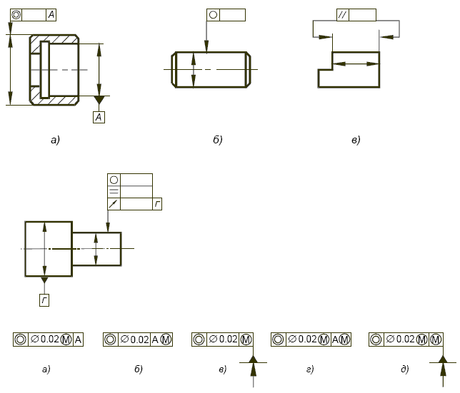 рис.9.5. Обозначение допусков формы и расположения на чертежах.