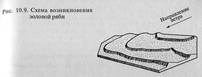 Наиболее распространены аккумулятивные и аккумулятивно-дефляционные формы рельефа, образующиеся в результате перемещения и отложения ветром песчаных частиц, а также дефляционные (выработанные) эоловые формы рельефа, возникающие за счет выдувания (дефляции) рыхлых продуктов выветривания, разрушения горных пород под воздействием динамических ударов самого ветра и особенно под действием ударов мелких частиц, переносимых ветром в ветропесчаном потоке.Среди дефляционных микроформ (до нескольких десятков сантиметров в поперечнике) наиболее распространены решетчатые или сотовые скалы, сложенные в основном терригенными породами (рис. 28); к формам средней величины (метры и десятки метров) относятся борозды (ярданги), ложбины, котлы и ниши выдувания, скалы причудливой формы (грибообразные, кольцевые и др.); к крупным выработанным формам (несколькокилометров в поперечнике) – котловины выдувания и солончаково-дефляционные впадины, образующиеся при совместном воздействии интенсивно протекающих процессов физико-химического (солевого) выветривания и дефляции, в том числе огромные площади до сотен километров, например впадина Карагие в Западном Казахстане. Наиболее распространенными аккумулятивными формами эолового рельефа являются барханы, песчаные гряды и эоловая рябь. Барханами называют асимметричные серповидные в плане песчаные формы, расположенные перпендикулярно господствующему направлению ветра. Наветренный склон их длинный и пологий. Он покрыт множеством