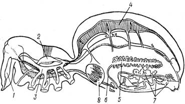 Рис. 3. Схема будови павука-хрестовика: 1 – отруйна залоза; 2 – смоктальний шлунок; 3 – сліпі придатки середньої кишки; 4 – серце; 5 – яєчник; 6 – яйцепровід; 7 – павутинні залози; 8 – легеня. Під час ембріонального розвитку на черевці закладається велика кількість кінцівок, але потім вони перетворюються на павутинні бородавки, в яких знаходяться протоки павутинних залоз. Із залоз виділяється напіврідка рідина, яка твердне на повітрі, утворюючи павутинні нитки, із яких павук будує ловильну сітку. Якщо до сітки потрапляє комаха, павук кидається до неї з своєї засідки (до неї протягнута сигнальна нитка), встромляє в її тіло кігтики з отрутою і вбиває жертву. Після цього павук обплутує комаху павутиною і на деякий час залишає її. Сік отруйних залоз не тільки вбиває комах, а й діє як травний сік. Приблизно через годину павук повертається до своєї здобичі і висмоктує з неї напіврідку, частково перетравлену їжу. Від вбитої комахи залишається тільки порожній хітиновий покрив. У зв'язку з цим травна система павука складно диференційована (рот, глотка, стравохід, смоктальний шлунок, кишка із сліпими виростами, слинні залози, печінка). У павука є практично всі форми травлення: поза організмом (під впливом соку отруйних залоз), порожнинне, або позаклітинне (в порожнині травного апарату під дією його травних соків), і внутрішньоклітинне (після всмоктування їжі в клітину). Павуки – ненажерливі хижаки, але можуть тривалий час голодувати. Дихальна система у павука-хрестовика представлена легеневими мішками і трахеями. Легеневі мішки і трахеї відкриваються назовні особливими отворами на боках члеників. У легеневих мішках є багато листоподібних складок, в яких проходять кровоносні капіляри. Трахеї представляють собою систему розгалужених трубочок, які підходять безпосередньо до багатьох органів (особливо у павукоподібних, що не мають легеневих мішків), де і відбувається тканинний газообмін. Кровоносна система складається із серця, яке знаходиться на спинній частині черевця, і судини, по якій кров рухається від серця до передньої частини тіла. Оскільки кровоносна система незамкнена, то в серце кров повертається із змішаної порожнини тіла (міксоцелю), де вона омиває легеневі мішки і трахеї, збагачуючись на кисень. Видільна система павука-хрестовика складається з кількох пар трубочок (мальпігієві судини), що розташовані в порожнині тіла. Із них продукти життєдіяльності надходять у задній відділ кишки. Нервова система характеризується злиттям нервових вузлів. У павуків весь нервовий ланцюг зливається в один головогрудний ганглій. Орган дотику – волоски, які вкривають кінцівки. Орган зору – чотири пари простих очей. Усі павукоподібні роздільностатеві. Самка павука-хрестовика відкладає восени яйця в сплетений із шовковистої павутини кокон, який ховає в затишних місцях (під корою пеньків, під камінням і т. п.). До зими самка гине, а з яєць, що перезимували в теплому коконі, весною виходять павучки. Деякі павуки проявляють турботу про потомство: відкладаючи яйця в кокон, носять його з собою. А самка тарантула носить свою молодь на спині. Серед павукоподібних є види, отрута яких небезпечна для людини і сільськогосподарських тварин (каракурт, скорпіон), паразити людини (коростяний кліщ) і кліщі – переносники збудників хвороб людини і тварин (тайговий кл