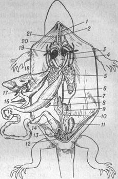 Рис 1. Анатомічна будова ящірки: 1 – стравохід; 2 – трахея; З – ліве передсердя; 4 – шлуночок; 5 – легені; 6 – спинна аорта; 7 – шлунок; 8 – селезінка; 9 – сім'яник; 10 – придаток сім'яника; 11 – нирка; 12 – клоака; 13 – сечовий міхур; 14 – товста кишка; 15 – дванадцятипала кишка; 16 – підшлункова залоза; 17 – жовчний міхур; 18 – печінка; 19 – праве передсердя; 20, 21 – сонна артерія.