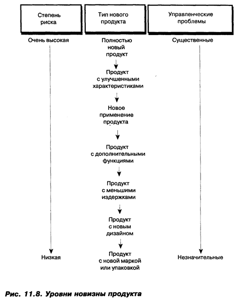 Вопросы 1. Как в НЭ была определена роль маркетинга среди других функций управления? 2. Прокомментируйте принципы деятельности НЭ. Нашли ли в них отражение идеи маркетинга? 3. Оцените стратегию маркетинга НЭ. 4. Как стратегия быстрого проникновения на рынок нашла отражение в деятельности НЭ? 5. Рассмотрите маркетинговую деятельность НЭ с позиций структуры комплекса маркетинга (концепции «4Р»). 6. Что является продуктом компании НЭ? 7. Выделите и опишите окружение продукта. 8. Имеют ли авиаперевозки торговую марку? 9. В чем заключается имидж компании НЭ, из каких составляющих он складывется? 10. Можно ли рассматривать переоборудование самолета как совершенствование продукта? 11. В каком направлении следует совершенствовать услуги компании НЭ? Новый продукт – продукция, услуга или идея, которые воспринимаются некоторыми потенциальными потребителями как новые. Можно выделить несколько уровней новизны продукта: от полностью нового продукта до продукта с новой маркой или упаковкой (рис. 11.8). Из рис. 11.8 также вытекает, что разработка полностью нового продукта обусловливает появление существенных управленческих проблем и связана с высоким риском.