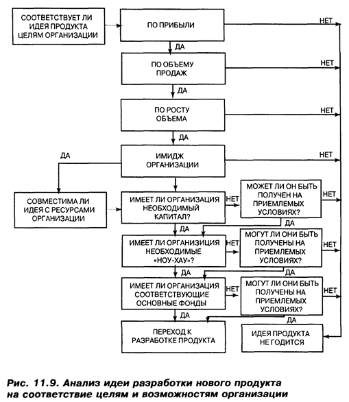Разработка нового продукта – создание оригинальных продуктов, улучшение продуктов и их модернизация, разработка новых марок продуктов путем проведения организацией своих собственных НИОКР. Процесс разработки нового продукта состоит из восьми этапов; генерация идей, отбор идей, разработка концепции и ее проверка, разработка маркетинговой стратегии, анализ бизнеса, разработка непосредственно продукта, пробный маркетинг и коммерческое производство. Генерация идей – систематический поиск идей о новых продуктах. Поиск новых идей осуществляется главным образом на основе внутренних источников организации (в отделе новой техники, в службе НИОКР, в отделе маркетинга и сбыта и т.п.), изучения мнений потребителей, конкурентов, поставщиков и дистрибьюторов, консультационных организаций, работы выставок и различных печатных изданий, путем использования специальных методов генерации идей. Отбор идей – анализ всех выдвинутых идей о новом продукте с целью отсеивания неперспективных из их числа на наиболее ранней стадии разработки. В результате отбираются идеи о возможном продукте, который организация может предложить рынку. Разработка концепции и ее проверка – идея о новом продукте трансформируется в концепцию продукта, которая испытывается на группе целевых потребителей с целью определения степени ее привлекательности. Концепция может быть представлена потребителям словесно или в виде иллюстраций. Разработка маркетинговой стратегии – определение маркетинговой стратегии первоначального выхода на рынок с новым продуктом. Здесь рассматриваются следующие вопросы. Прежде всего описываются размер, структура и характер целевого рынка, осуществляется позиционирование нового продукта. Далее даются оценки объему продаж, рыночной доле, цене, прибыли, осуществляется выбор каналов сбыта. Безусловно, что в большинстве случаев такие прогнозные оценки носят весьма ориентировочный характер. Однако использование даже ориентировочных оценок лучше, нежели их полное отсутствие. Для получения информации о новом продукте проводят опросы (потребителей, сотрудников торговых организаций, отдельных экспертов). Информация прогнозного характера о возможной рыночной судьбе нового продукта также может быть получена на основе анализа объема продаж (скажем, путем изучения кривых жизненного цикла) подобных продуктов, из анализа ситуации в области конкурентной борьбы. Анализ бизнеса – оценка для нового продукта предполагаемых величин объема продаж, издержек и прибыли на предмет их соответствия целям организации. Другими словами, речь идет об оценке привлекательности для компании данного нового продукта. На рис. 11.9 приводится блок-схема проведения такого анализа.