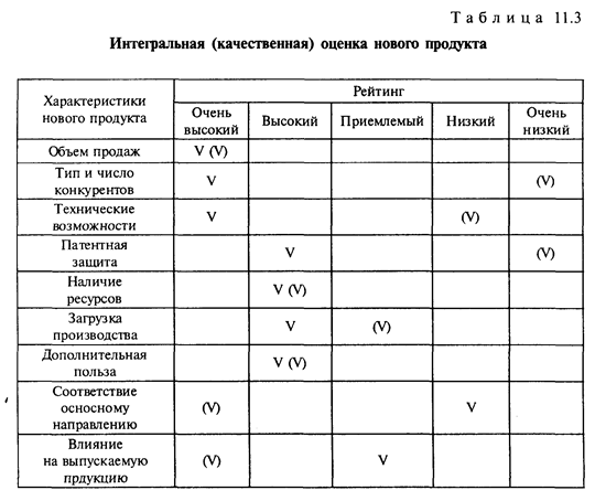 Разработка непосредственно продукта – трансформация концепции нового продукта в материальный продукт; цель – убедиться в том, что идея продукта может быть доведена до стадии работающего образца. Разработка продукта – более широкое понятие по сравнению с НИОКР; представляет трансформацию концепции нового продукта в материальный продукт, имеющий законченный товарный вид, т.е. включает также маркетинговую разработку продукта. При выборе лучшего варианта нового продукта могут использоваться различные методы, простейший из которых представлен в табл. 11.3. «Галочками» в таблице отмечена степень соответствия каждого из двух оцениваемых новых продуктов требуемым характеристикам (критериям). Видно, что первый продукт по сравнению со вторым имеет более высокую интегральную оценку.