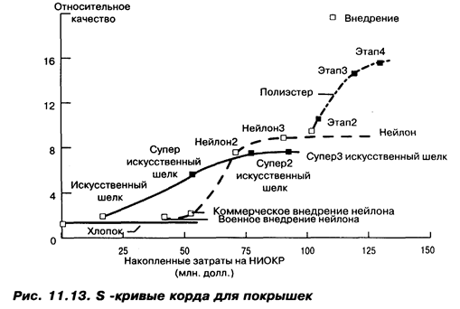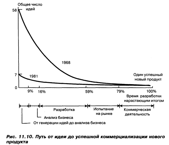 Фактор ускорения динамики S-кривых поясним на примере рис. 11.13. Из рис. 11.13 следует, что новый принцип, положенный в основу разработки нового продукта, на начальном этапе своего освоения, вследствие его менее эффективного использования, дает меньшее значение показателя качества, нежели более отработанные, ранее взятые на вооружение принципы. Кроме того, наступает «насыщение» в эффективности использования каждого принципа, стимулирующее поиск новых идей. Организации, являющиеся лидерами в области разработки новых продуктов, обычно уделяют много внимания выявлению факторов их успеха, проводя в этой области специальные исследования. Так, на рис. 11.14 представлена совокупность ключевых факторов успешного управления разработкой нового продукта. Конкретизация общих факторов успеха обычно осуществляется в направлении получения количественных оценок, характеризующих их относительную роль. Проблема настолько важна, что ее интенсивно исследуют. Ниже приводятся результаты таких исследований.