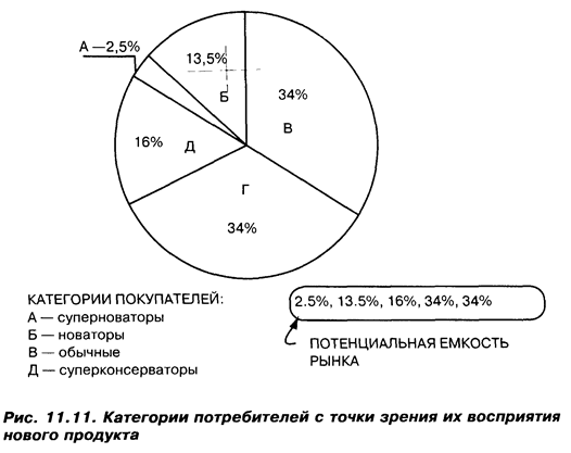Организиация разработки новых продуктов в компании может осуществляться по-разному: 1. Продуктовому управляющему параллельно с его работой с текущими продуктами поручается также в сфере его деятельности разработка новых продуктов (вопросы организации маркетинга подробно рассмотрены в разделе с соответствующим названием). 2. Назначается специальный управляющий, ответственный за разработку конкретного нового продукта. 3. Ряд компаний на уровне своего руководства имеют специальный комитет, который рассматривает предложения о новых продуктах. 4. В крупных компаниях часто создаются специальные отделы по разработке новых продуктов, которые занимаются всем кругом проблем от генерации идей до их материализации. 5. Создаются специальные временные рабочие группы, занимающиеся разработкой конкретного нового продукта. 6. Используется программный подход. В данном случае разработка нового продукта осуществляется в рамках специальной программы. При организации разработки нового продукта может быть использована последовательная разработка продукта и одновременная разработка продукта. Последовательная разработка продукта характеризуется тем, что каждое соответствующее подразделение организации осуществляет свои работы индивидуально, после их завершения которых передает разработку нового продукта в другое подразделение для выполнения работ на следующей стадии разработки. Одновременная разработка продукта характеризуется тем, что при разработке нового продукта различные подразделения организации работают в тесном контакте, перекрывая в целях экономии времени этапы разработки. Рыночная судьба нового продукта зависит от того, готов или нет потребитель принять новинку. Процесс принятия новинки – мысленный процесс, через который проходит индивид, начиная с момента получения первой информации о новом продукте до его окончательного принятия, то есть до решения стать постоянным пользователем данного продукта. Процесс восприятия включает пять стадий: получение начальной информации о новинке – первоначальная осведомленность; появление интереса – начинается поиск информации о новинке; оценка – потребитель решает, стоит ли опробовать новинку; опробование и принятие решения о том, чтобы стать постоянным пользователем нового продукта. Вышеизложенное означает, что маркетолог, продвигающий новый продукт, должен способствовать прохождению потребителей через стадии принятия новинки. Например, потребитель, пройдя все начальные стадии, не решается купить новый продукт. Предоставление, скажем, электроплиты для испытания во временное пользование с минимальной (или без нее) оплатой, может стимулировать покупку данной электроплиты. Потребители весьма существенно отличаются друг от друга по степени своей готовности опробовать новый продукт. Некоторые из них очень быстро воспринимают новый продукт, другие – медленно. В зависимости от времени, требуемого для принятия нового продукта, готовности его испытать потребители делятся (рис. 11.11) на: 1. Суперноваторов, т.е. потребителей, готовых пойти на риск приобретения неизвестного продукта (2,5%). (Здесь и далее цифры в скобках характеризуют процентную численность рассмотренных групп потребителей.) Для таких людей, образно говоря, нет большего счастья в жизни, как покупка престиж