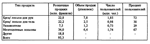 Розничная продажа парфюмерных средств в 1975 г. составляла 535,3 млн. франков в Швейцарии. Приблизительные расходы на парфюмерные средства для одной женщины в 1975 году были равны 210 франкам. Рынок женской косметики состоял из нескольких сегментов (см. табл. 4). Общие продажи косметики в Швейцарии увеличились с 1974 г. по 1975 г. на 12,6%. Произошли также изменения в структуре рынка. Продажи духов и средств для кожи, включая лосьоны многоцелевого использования, значительно увеличились, тогда как произошел спад в объеме продаж косметики для глаз и лица. Согласно мнениям некоторых специалистов, потенциальный рынок средств для кожи изменяется в зависимости от страны. Уровни продаж определяются не только типом кожи, доминирующим в той или иной стране, но и уровнем доходов женщин. Частично из-за высокого уровня жизни в Швейцарии и того факта, что сравнительно большая часть женщин здесь – светлокожие, расход каждой женщине на средства для ухода за кожей был выше, чем в других европейских странах, кроме Германии. В 1973 г. средняя швейцарская женщина тратила около 37 франков на лосьоны для ухода за кожей. В табл. 5 дается характеристика рынку различных видов косметики для кожи в Швейцарии, включая всевозможные лосьоны. Таблица 4