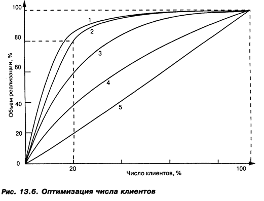 Предприятие по результатам сбыта, скажем, за год, ранжирует своих клиентов по объемам закупок. Далее на поле графика наносится точка, связывающая первого клиента, сделавшего самые объемные закупки, с процентной величиной этих закупок (от 100 процентов). Затем нарастающим итогом наносятся точки для всех других клиентов. В итоге выходим в точку 100, характеризующую 100% закупок, сделанных 100% клиентов. Выход в нее осуществляется по одной из кривой типа 1, 2, 3, 4, изображенных на рис. 13.6. Если все клиенты закупили одинаковое количество продуктов, то точки 0 и 100 свяжет прямая линия (5). Самая крутая линия (1) получается в случае, когда небольшое число клиентов закупает львиную долю продуктов. Варианты, тяготеющие к прямой линии, являются самыми надежными (роль каждого клиента в общем объеме закупок невелика), но в то же время – не самыми дешевыми, более сложными в организационно-техническом плане. Действительно, надо иметь развернутые штаты сбытовиков, бухгалтеров для заключения договоров о поставках, отслеживания отгрузки товаров, оплаты счетов и т.п. Варианты, тяготеющие к линии 1, не обладают данными недостатками, но являются наименее надежными, так как сбыт зависит от небольшого числа клиентов.