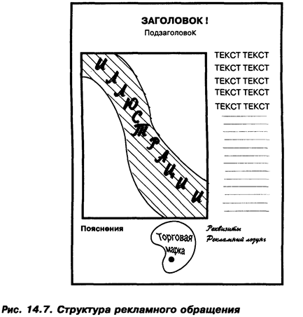 После того как рекламное обращение привлекло внимание, оно должно создать интерес. Потребитель смотрит в рекламное объявление, и теперь необходимо удержать его внимание, чтобы не потерять его как покупателя. Поэтому с потребителем следует говорить о его проблемах и потребностях. Интерес – это мостик между вниманием и доверием. Существует несколько способов создать и удержать интерес. Можно использовать персонажей из известных фильмов и другие визуальные образы, элементы рассказа, оригинальные рубрики, диаграммы или таблицы. Потребитель должен вчитаться в обращение. При быстром просматривании рекламы любой человек, как правило, прочитывает только первые семь слов текста. Остальное зависит от этих семи слов. Интерес и доверие к рекламе повышаются, когда ее содержание соответствует взглядам, жизненному опыту, денежным возможностям и другим характеристикам потребителей. В этом плане наилучший эффект достигается, когда рекламная кампания ориентирована на определенные сегменты потребителей и применяются СМИ, наиболее часто ими используемые. Следующий шаг – создание доверия. Приводимые данные, например, о контрольных испытаниях товара, должны быть правдивыми. Доверие к рекламе может возрастать, если в ней участвует авторитетный человек. Чтобы усилить желание потребителя иметь товар, необходимо его информировать о пользе товара. Каждое новое полезное свойство должно усиливать желание, поскольку это свойство совпадает с реальной или воображаемой потребностью потребителя. Даже если у товара существует только одно полезное свойство, оно должно быть представлено так, чтобы потребитель поверил в него и понял, что оно применимо к его потребностям. Необходимо стремиться побудить потребителя сделать что-нибудь или, по крайней мере, согласиться с призывами рекламы. Действие может быть совершено немедленно или в будущем. Побуждение к действию может быть прямым: «Посетите нашу распродажу 15 мая» или косвенным: «Приятно отправляться в полет среди друзей». Побуждение к действию обязательно должно быть заложено в тексте. Все рекламные тексты состоят из ряда элементов или компонентов (рис. 14.7). Главным привлекающим внимание элементом текста обычно является заголовок. Заголовок выполняет шесть функций. Во-первых, он должен привлекать внимание. Во-вторых, заголовок должен выбирать своего читателя, для чего аудиторию классифицируют по определенным признакам и обращаются только к молодым, женщинам, богатым и т.п. В-третьих, заголовок должен вводить читателя в главную часть текста. В-четвертых, в заголовке должна найти полное отражение идея рекламного обращения. Заголовок создает настроение и образ, предлагает сделать покупку и называет марку товара. В-пятых, заголовок должен обещать пользу покупателю от покупки. В-шестых, в заголовке должно быть отражено то новое в товаре, что интересует читателя. Потребителя интересуют новые товары, новые способы применения старых товаров или усовершенствования последних. Следовательно, слова, подразумевающие это новое, увеличивают читаемость сообщений и должны использоваться как можно шире. Среди этих слов можно использовать: «усовершенствованный»; «революционный», «только что полученный», «важный шаг вперед» и т.п.