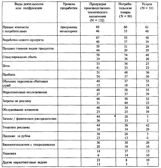 В табл. 15.7 приводятся данные, характеризующие уровень использования оперативных планов по отдельным направлениям маркетинговой деятельности (программ действий по отдельным направлениям маркетинговой деятельности) различными компаниями (верхние строчки таблицы). Было опрошено руководство маркетинговых подразделений 132 компаний, выпускающих продукцию производственно-технического назначения, 96 компаний, выпускающих потребительские товары, и 31 компания в сфере сервиса. В этой же таблице приводятся данные, характеризующие уровень использования различными компаниями специальных процедур по мониторингу степени достижения целей маркетинговой деятельности (нижние строчки каждой позиции таблицы). Маркетинговые планы иногда представляют руководству в два этапа: вначале – как стратегический план и позже – как план реализации этих стратегий (план действий или оперативные планы и программы). Такой подход позволяет первоначально сконцентрировать внимание на выработке маркетинговых стратегий, не обременяя себя деталями их реализации. Далее разрабатывается бюджет маркетинга, составление которого помогает правильно установить приоритеты между целями и стратегиями маркетинговой деятельности, принять решения в области распределения ресурсов, осуществить эффективный контроль (табл. 15.8). Затраты на осуществление отдельных элементов маркетинга, представленных в бюджете, выводятся из детального маркетингового плана.